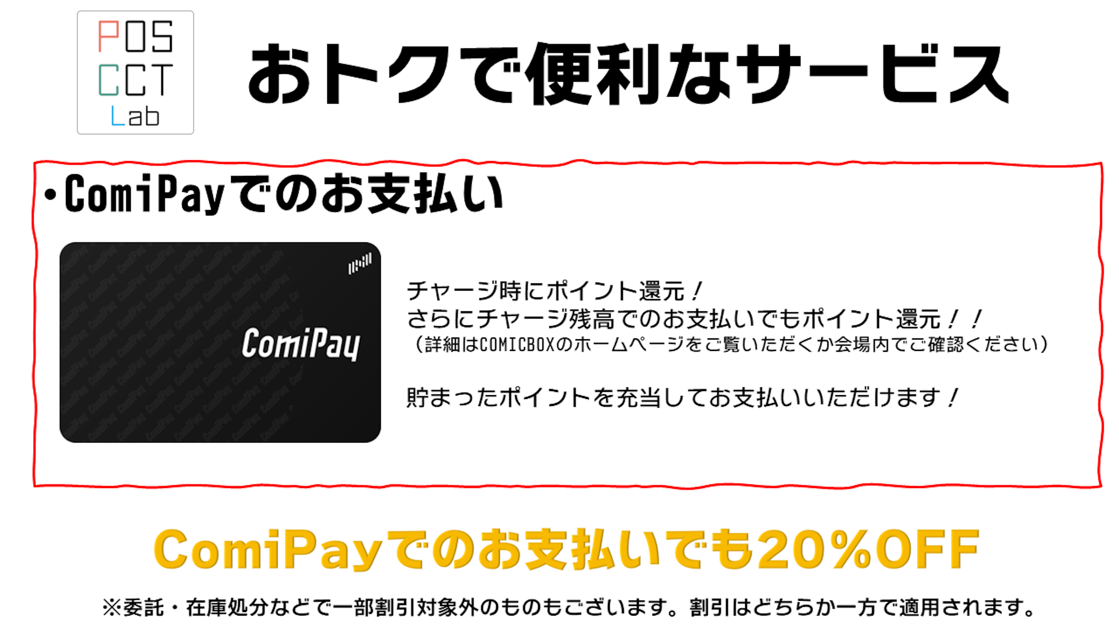 今回もキャッシュレス割引とスマートレシート割引に加え、COMIC BOX#0で使えるオリジナルプリペイド「ComiPay」でお支払い頂いても割引適用となります!