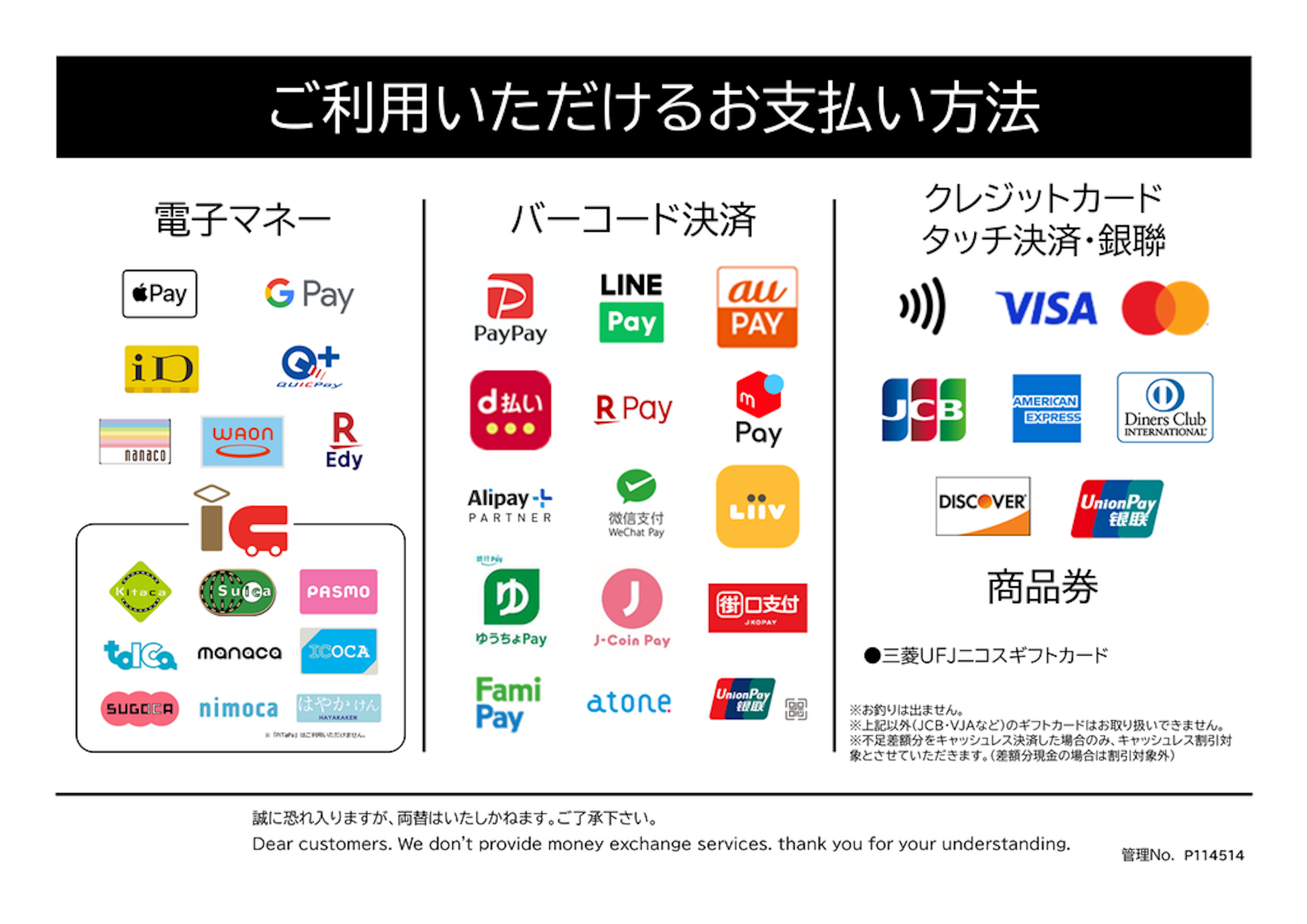 PayPayやd払い、楽天ペイなどの国内系コード決済に関しましては従来どおりUnivapayStoreAppもしくはpCAT・JPQRにて決済させていただきます。